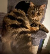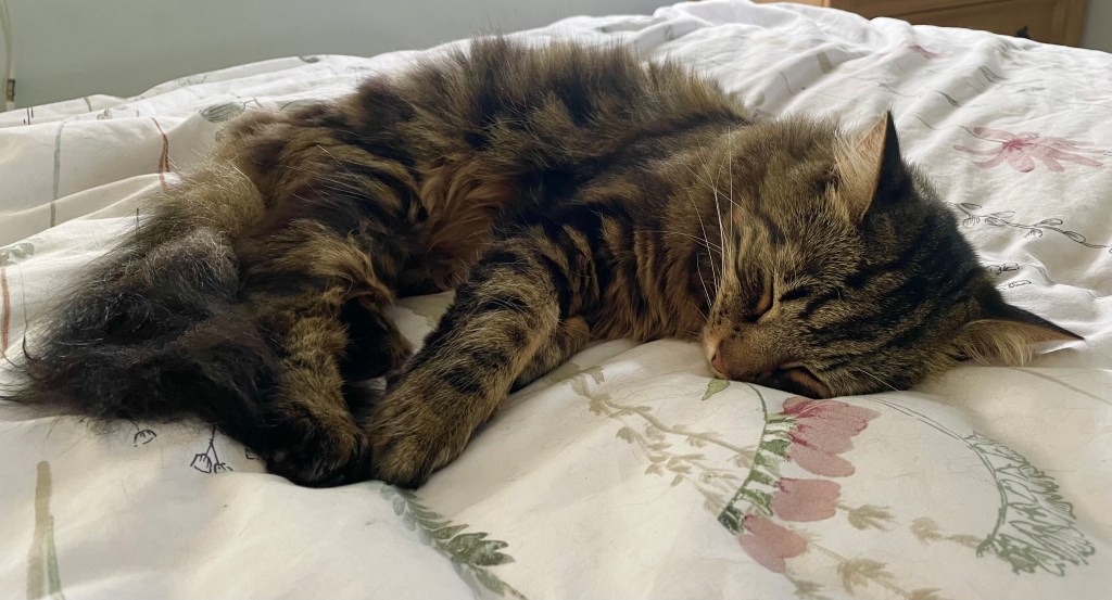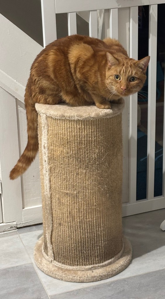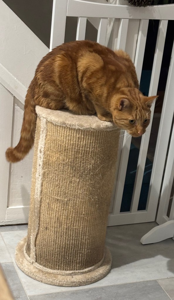 (Here Schrodinger pauses for a meditative bat at one of his tinkleballs, a chew on his favourite feather wand and to change position from one box in his Deluxe Multi-storey Cat Tree to another…He composes himself, wondering whether or not it is yet time for Dreamies, and continues…)