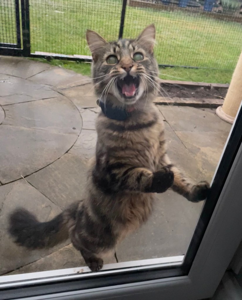 I howled. Oh how I howled. I howled, I screamed and I screeched. I paddled at the locked door and moaned. I tried to climb the walls of The Abomination to get out of it. I whined and I cried and I yelled. And have I mentioned the worst part? Reader, it was doing BigWetz!!! BigBigWetz from the SkyTap! And Hoomama refused to turn it off! All loyal cats will know that there is no excuse EVER to leave us outside in the BigWetz, such treatment is wholly unacceptable and entirely beyond the pale.