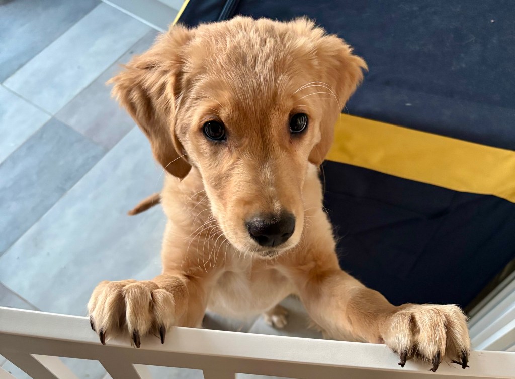 Well, at first Stinkie Barkie was confined to the kitchen, behind wooden gates.  These allowed my brother and I to stare balefully at him from the upstairs landing as he looked around in confusion at his new world…and pee’d everywhere.  (I mean it was EVERYWHERE! Shocking behaviour! I couldn’t BELIEVE it!)